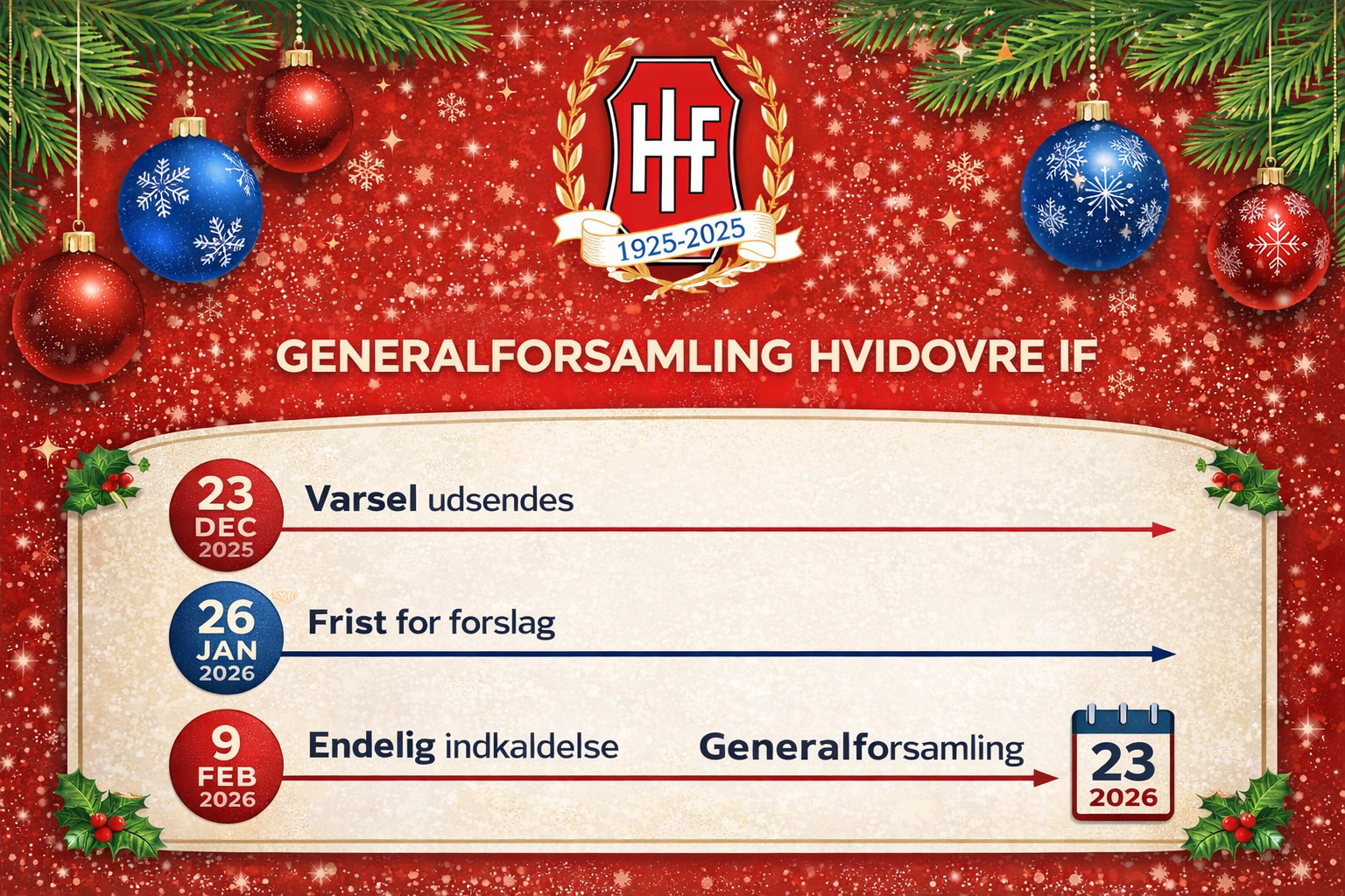 Hermed fremsendes varsel om ordinær generalforsamling i Hvidovre IF, fodboldafdelingen, som afholdes mandag den 23. februar 2026 kl. 19.00, i stadionrestauranten.